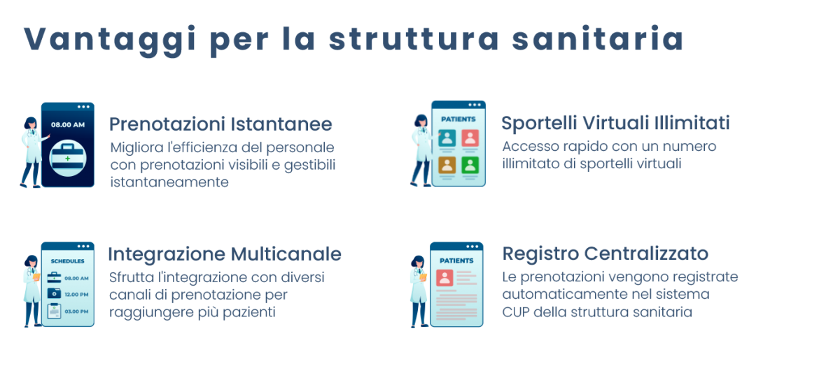 Questa funzionalità fornisce alla struttura un numero potenzialmente illimitato di sportelli virtuali, aumentando la capacità di gestione delle prenotazioni. Le funzionalità del sistema possono essere integrate con diversi canali di prenotazione della struttura, come ad esempio la gestione delle chiamate al centralino.